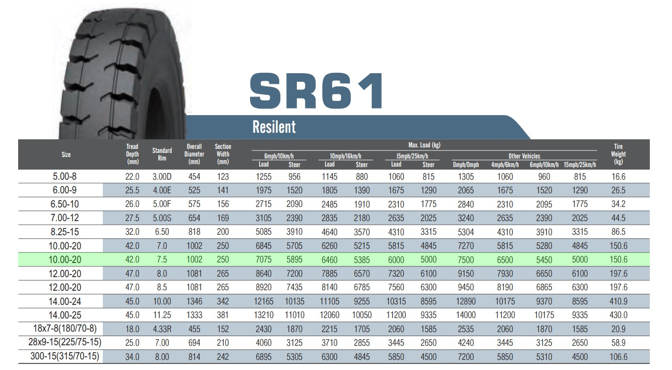 Westlake SR61 w rozmiarze 10.00-20 jest oponą pełną, solidną i zaprojektowaną z myślą o najbardziej wymagających warunkach. Wysoki bieżnik, bardzo wolno ścierająca się mieszanka gumy oraz 5-letnia gwarancja czynią z modelu SR61 jeden z najlepszych modeli wśród opon przemysłowych – definicja niezawodności charakteryzująca się bardzo dobrym stosunkiem jakości do ceny. Idealne dopasowanie do maszyn takich producentów jak Still, Linde, Nissan czy Toyota, które pracując w ciężkich warunkach wymagają opon pełnych.