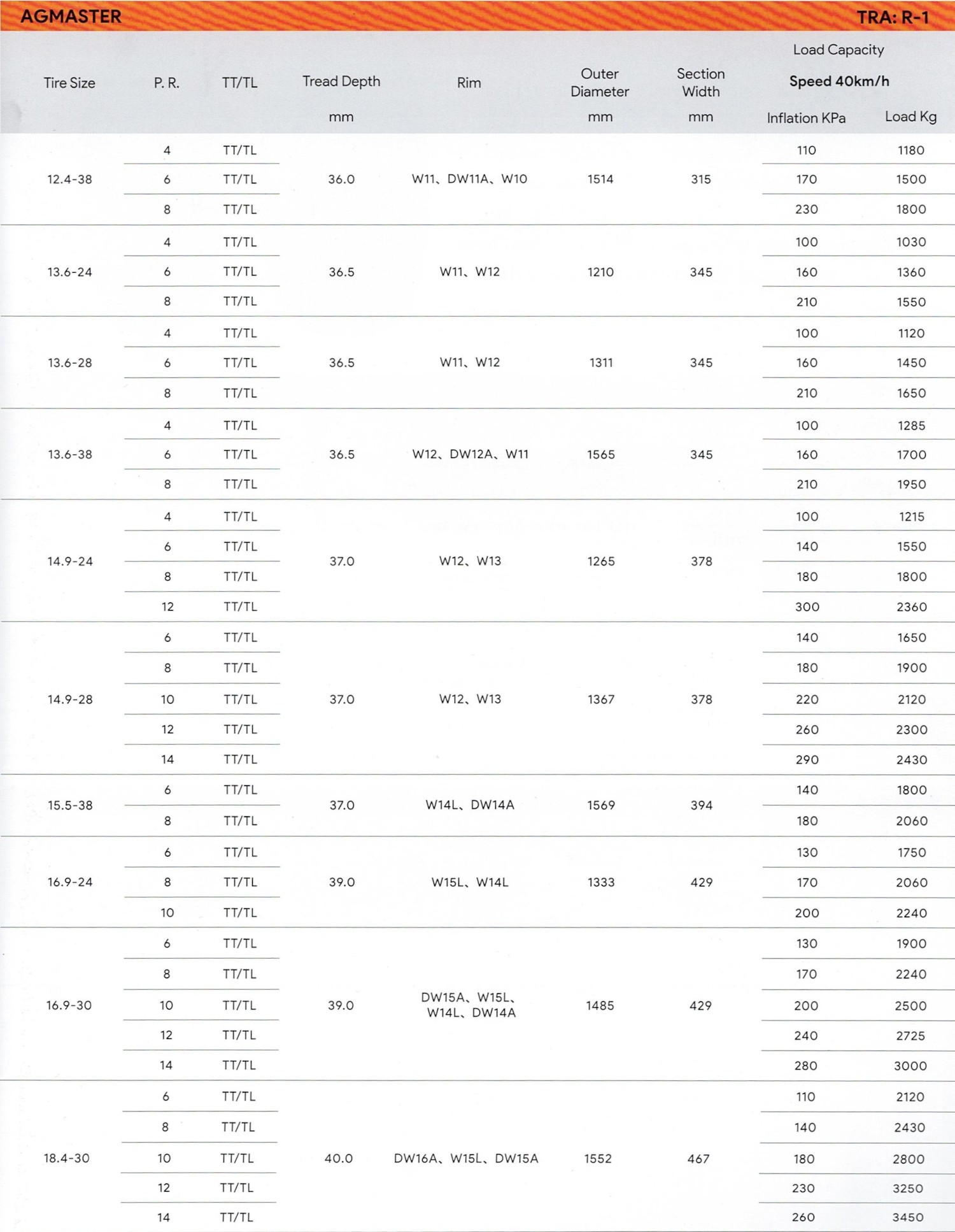 16.9-24 16.9-28 320/85R24 360/70R24 340/85R24 380/70R24 420/70R24 380/85R24 420/85R24 460/70R24 280/85R28 340/85R28 360/70R28 380/70R28 420/70R28 380/85R28 540/65R30 600/70R30 230/95R32 270/95R32 800/65R32 420/85R34 480/70R34 540/65R34 460/85R34 520/70R34 420/85R38 460/85R38 540/65R38 520/70R38 520/85R38 580/70R38 600/65R38 650/65R38 710/70R38