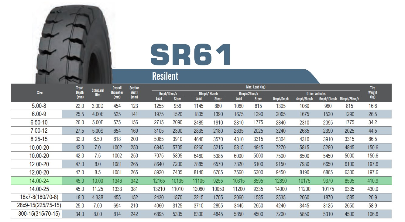 Westlake SR61 w rozmiarze 14.00-24 jest oponą pełną, solidną i zaprojektowaną z myślą o najbardziej wymagających warunkach. Wysoki bieżnik, bardzo wolno ścierająca się mieszanka gumy oraz 5-letnia gwarancja czynią z modelu SR61 jeden z najlepszych modeli wśród opon przemysłowych – definicja niezawodności charakteryzująca się bardzo dobrym stosunkiem jakości  do ceny. Idealne dopasowanie do maszyn takich producentów jak Still, Linde, Nissan czy Toyota, które pracując w ciężkich warunkach wymagają opon pełnych.