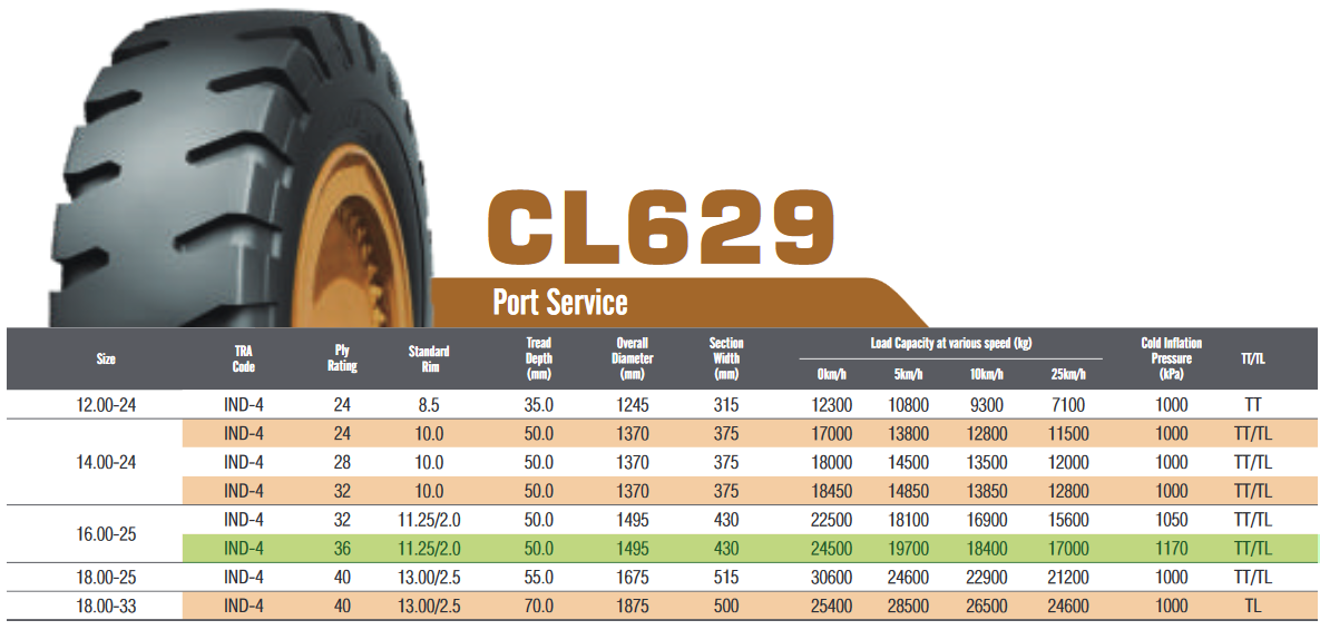Opona Westlake CL629 jest najmocniejszą oponą portową pneumatyczną dostępną w Polsce. Masywny, potężny bieżnik, szeroka i gruba stopka oraz ogromne ilości płócien czynią z tej opony topowy produkt do zastosowania we wszelkiego rodzaju maszynach pracujących w portach. 5 lat gwarancji producenta z ogromnym zapleczem technologicznym oraz wieloletnim doświadczeniem zapewniają maksymalne, bezawaryjne przebiegi.