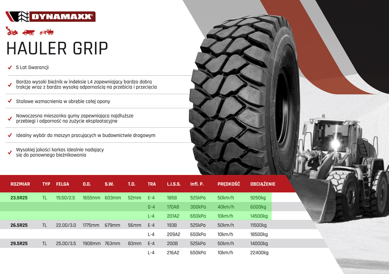 23.5R25 DYNAMAXX HAULER GRIP E4/L4 185B/170A8/201A2 TL 5 LAT GWARANCJI