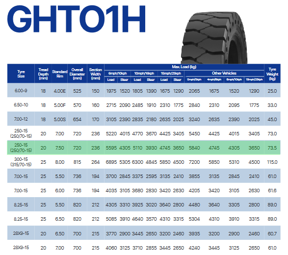 Westlake GHT01H w rozmiarze 250-15 (250/70-15) SIT jest solidną, pełną oponą przeznaczoną do wszelkich wózków widłowych wymagających najlepszego ogumienia. Nowoczesna konstrukcja połączona z otworami przechodzącymi przez całą szerokość tego modelu zapewnia bardzo wysokie odprowadzanie ciepła podczas użytkowania opony GHT01H, a także dostarcza niespotykany jak na opony pełne komfort jazdy oraz tłumienie nierówności. Dodatkowo aby zapewnić maksymalną odporność na uszkodzenia Westlake GHT01H posiada wystający rant chroniący felgę przed uszkodzeniem (RIM GUARD), bardzo wolno ścierającą się mieszankę gumy, wysoki bieżnik oraz 5-letnią gwarancję producenta. Idealny wybór do wózków widłowych takich firm jak Still, Linde, Nissan czy Toyota.
