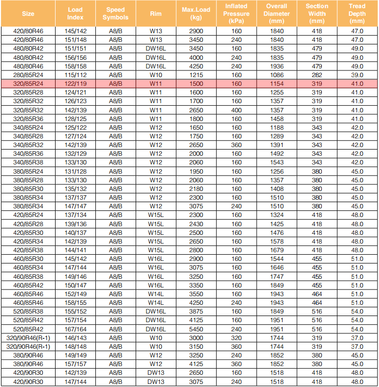 16.9-24 16.9-28 320/85R24 360/70R24 340/85R24 380/70R24 420/70R24 380/85R24 420/85R24 460/70R24 280/85R28 340/85R28 360/70R28 380/70R28 420/70R28 380/85R28 540/65R30 600/70R30 230/95R32 270/95R32 800/65R32 420/85R34 480/70R34 540/65R34 460/85R34 520/70R34 420/85R38 460/85R38 540/65R38 520/70R38 520/85R38 580/70R38 600/65R38 650/65R38 710/70R38