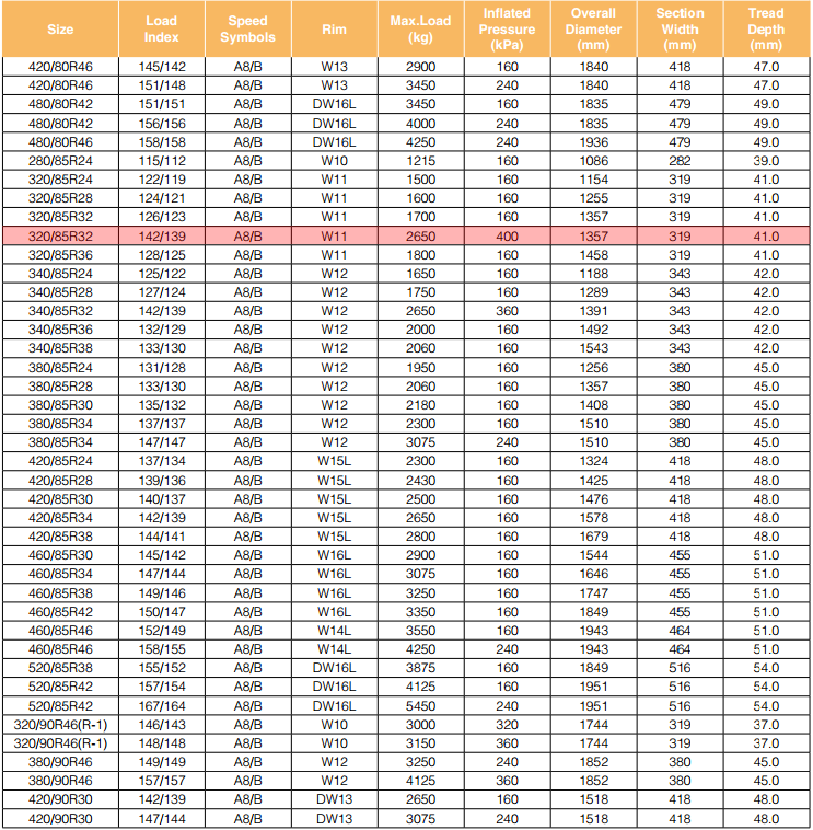 16.9-24 16.9-28 320/85R24 360/70R24 340/85R24 380/70R24 420/70R24 380/85R24 420/85R24 460/70R24 280/85R28 340/85R28 360/70R28 380/70R28 420/70R28 380/85R28 540/65R30 600/70R30 230/95R32 270/95R32 800/65R32 420/85R34 480/70R34 540/65R34 460/85R34 520/70R34 420/85R38 460/85R38 540/65R38 520/70R38 520/85R38 580/70R38 600/65R38 650/65R38 710/70R38