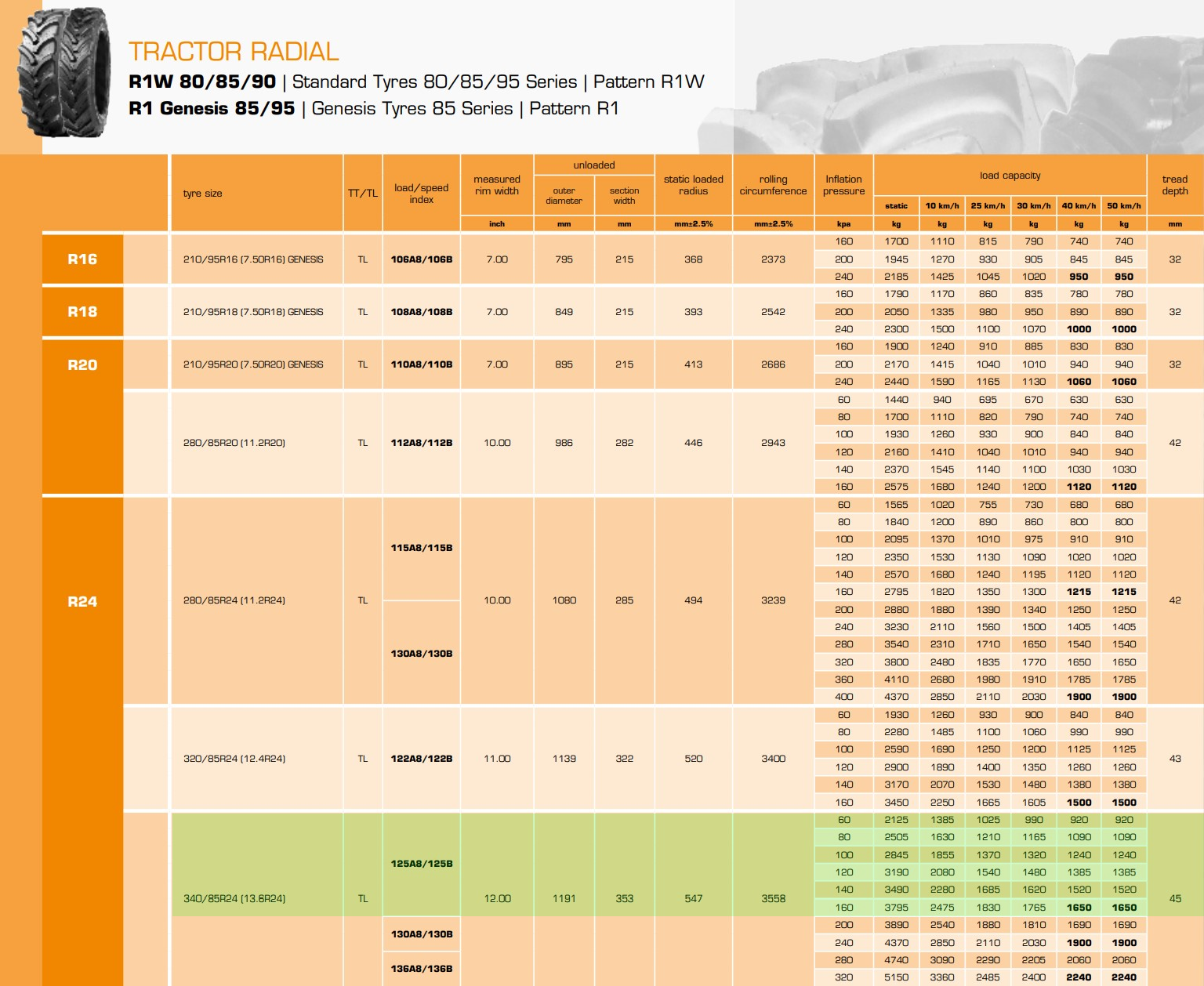 16.9-24 16.9-28 320/85R24 360/70R24 340/85R24 380/70R24 420/70R24 380/85R24 420/85R24 460/70R24 280/85R28 340/85R28 360/70R28 380/70R28 420/70R28 380/85R28 540/65R30 600/70R30 230/95R32 270/95R32 800/65R32 420/85R34 480/70R34 540/65R34 460/85R34 520/70R34 420/85R38 460/85R38 540/65R38 520/70R38 520/85R38 580/70R38 600/65R38 650/65R38 710/70R38