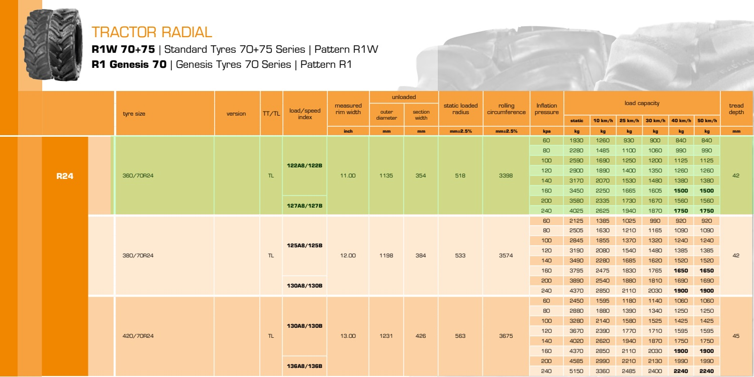 16.9-24 16.9-28 320/85R24 360/70R24 340/85R24 380/70R24 420/70R24 380/85R24 420/85R24 460/70R24 280/85R28 340/85R28 360/70R28 380/70R28 420/70R28 380/85R28 540/65R30 600/70R30 230/95R32 270/95R32 800/65R32 420/85R34 480/70R34 540/65R34 460/85R34 520/70R34 420/85R38 460/85R38 540/65R38 520/70R38 520/85R38 580/70R38 600/65R38 650/65R38 710/70R38