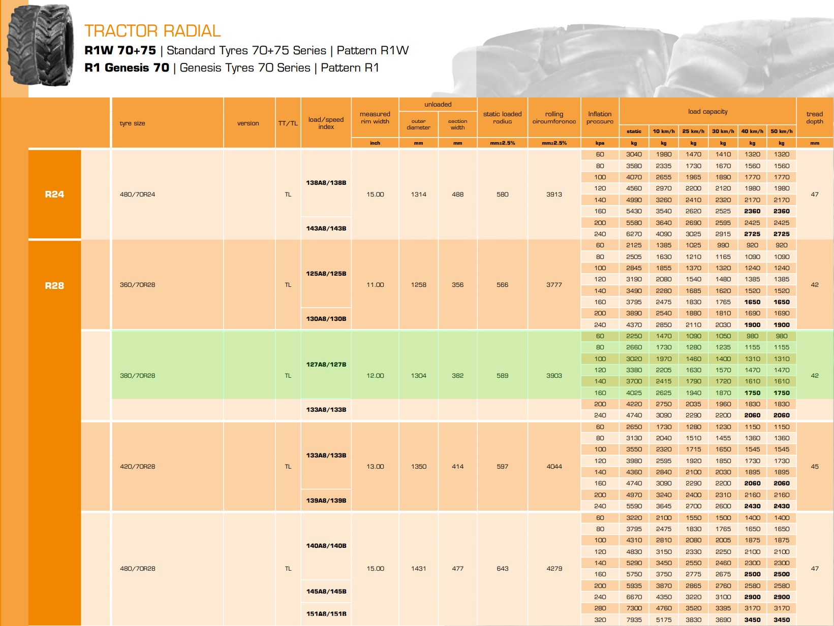 16.9-24 16.9-28 320/85R24 360/70R24 340/85R24 380/70R24 420/70R24 380/85R24 420/85R24 460/70R24 280/85R28 340/85R28 360/70R28 380/70R28 420/70R28 380/85R28 540/65R30 600/70R30 230/95R32 270/95R32 800/65R32 420/85R34 480/70R34 540/65R34 460/85R34 520/70R34 420/85R38 460/85R38 540/65R38 520/70R38 520/85R38 580/70R38 600/65R38 650/65R38 710/70R38