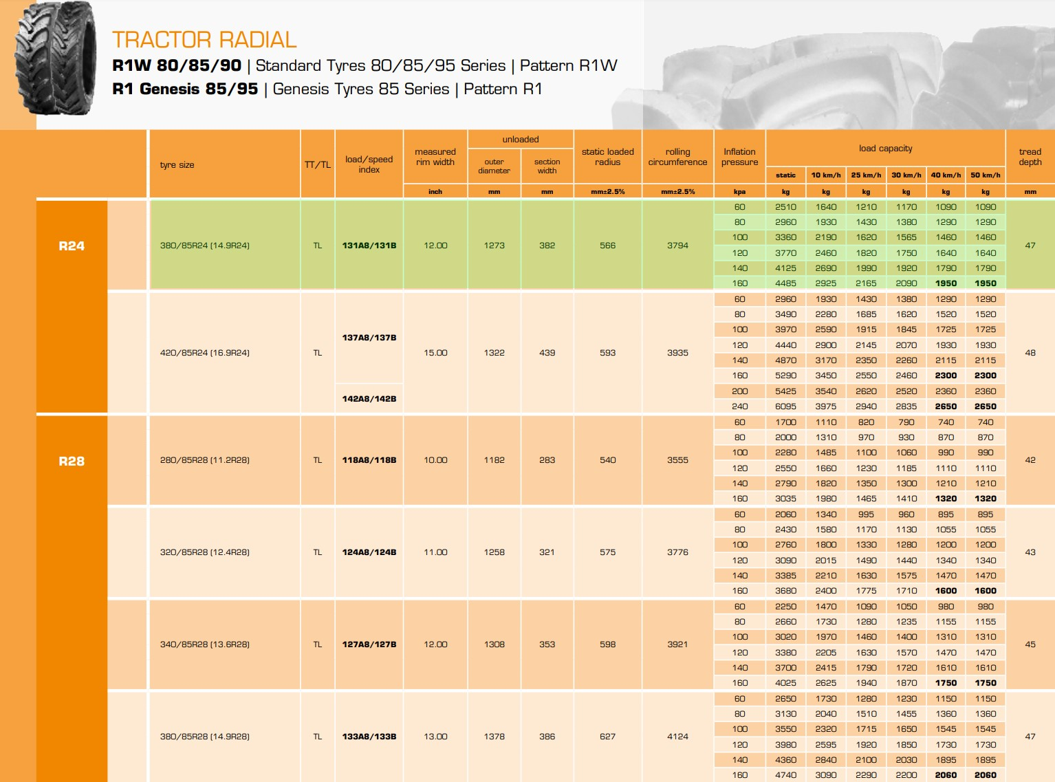 16.9-24 16.9-28 320/85R24 360/70R24 340/85R24 380/70R24 420/70R24 380/85R24 420/85R24 460/70R24 280/85R28 340/85R28 360/70R28 380/70R28 420/70R28 380/85R28 540/65R30 600/70R30 230/95R32 270/95R32 800/65R32 420/85R34 480/70R34 540/65R34 460/85R34 520/70R34 420/85R38 460/85R38 540/65R38 520/70R38 520/85R38 580/70R38 600/65R38 650/65R38 710/70R38
