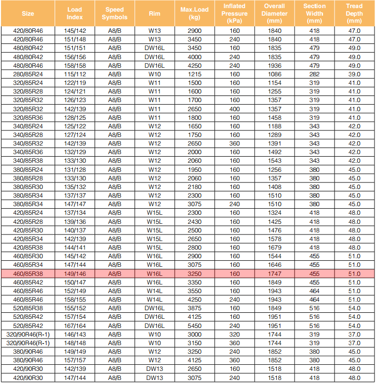16.9-24 16.9-28 320/85R24 360/70R24 340/85R24 380/70R24 420/70R24 380/85R24 420/85R24 460/70R24 280/85R28 340/85R28 360/70R28 380/70R28 420/70R28 380/85R28 540/65R30 600/70R30 230/95R32 270/95R32 800/65R32 420/85R34 480/70R34 540/65R34 460/85R34 520/70R34 420/85R38 460/85R38 540/65R38 520/70R38 520/85R38 580/70R38 600/65R38 650/65R38 710/70R38