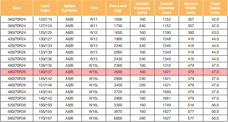 16.9-24 16.9-28 320/85R24 360/70R24 340/85R24 380/70R24 420/70R24 380/85R24 420/85R24 460/70R24 280/85R28 340/85R28 360/70R28 380/70R28 420/70R28 380/85R28 540/65R30 600/70R30 230/95R32 270/95R32 800/65R32 420/85R34 480/70R34 540/65R34 460/85R34 520/70R34 420/85R38 460/85R38 540/65R38 520/70R38 520/85R38 580/70R38 600/65R38 650/65R38 710/70R38