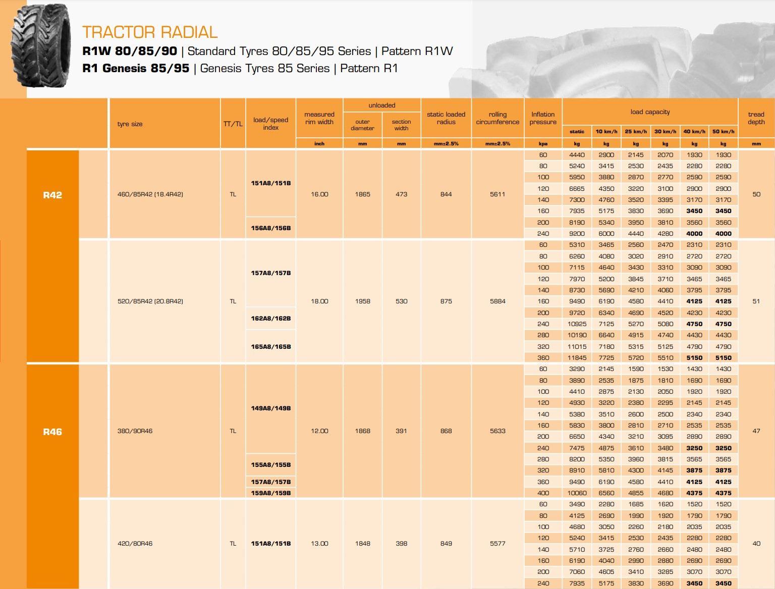 16.9-24 16.9-28 320/85R24 360/70R24 340/85R24 380/70R24 420/70R24 380/85R24 420/85R24 460/70R24 280/85R28 340/85R28 360/70R28 380/70R28 420/70R28 380/85R28 540/65R30 600/70R30 230/95R32 270/95R32 800/65R32 420/85R34 480/70R34 540/65R34 460/85R34 520/70R34 420/85R38 460/85R38 540/65R38 520/70R38 520/85R38 580/70R38 600/65R38 650/65R38 710/70R38