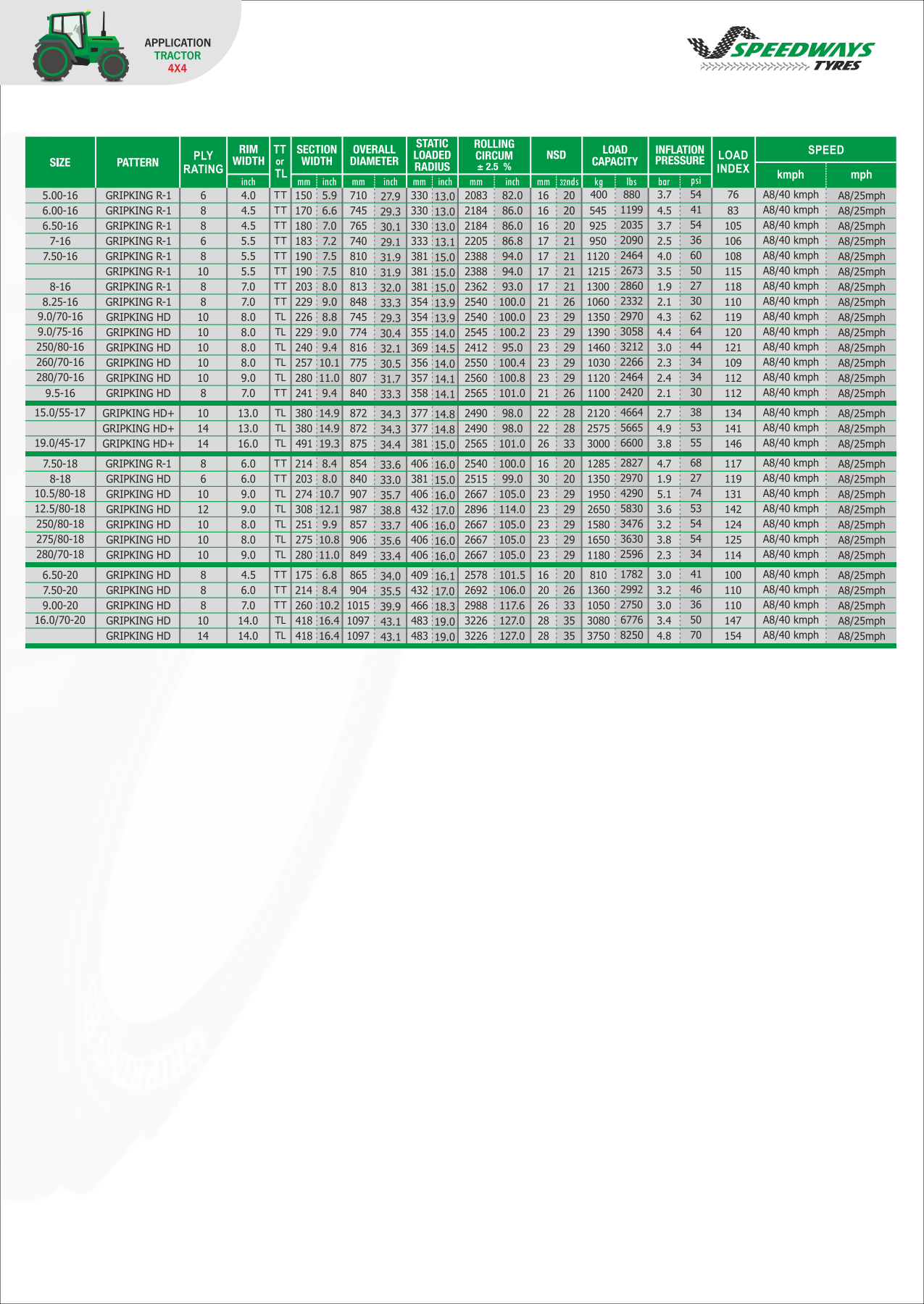 Speedways Gripking jest wytrzymałą oponą rolniczą sprawdzoną w polu przez naszych klientów. Jej głównymi cechami jest nowy, zapewniający maksymalną trakcję bieżnik. Dodatkowo dzięki wysokim klockom bieżnika i wolno ścierającej się mieszance opona ta sklasyfikowana jest jako bardzo żywotna, zapewniająca długą i bezproblemową pracę.
