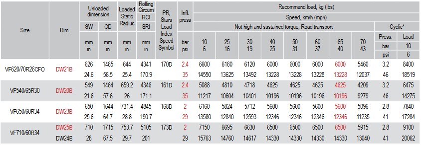 Doskonałe prowadzenia na drodze i komfort Grube ściany boczne Mieszanka gumy Oszczędność paliwa Samooczyszczanie się bieżnika Technologia VF Zredukowane ubijanie gleby Zwiększona nośność